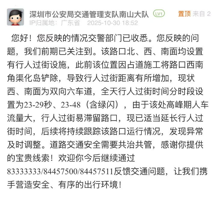 案例點(diǎn)評(píng):南山交管部門在24小時(shí)內(nèi)對(duì)市民所反饋的問題進(jìn)行答復(fù),展現(xiàn)出精準(zhǔn)、高效的治理態(tài)度,既說明過街時(shí)間短的原因,又根據(jù)該路口在高峰期人流大的實(shí)際情況,適當(dāng)延長(zhǎng)過街時(shí)間,體現(xiàn)出“因需調(diào)整、務(wù)實(shí)便民”的理念。回應(yīng)中,該部門還強(qiáng)調(diào)后續(xù)將持續(xù)跟蹤路口通行情況、及時(shí)優(yōu)化調(diào)整等,展示了精細(xì)化治理的決心和理念。